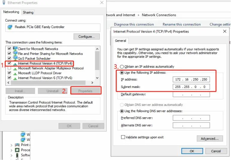 Set IP address: 172.16.250.250, subnet mask: 255.255.255.0