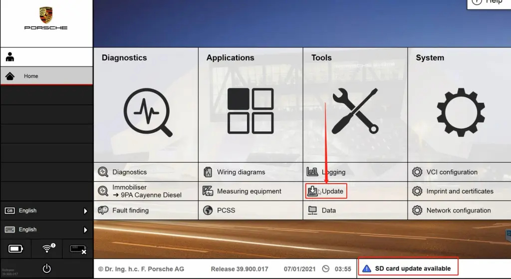 Insert the upgraded SD card into the SD card position of the Porsche CF54 computer, and then click Update, the piwis software will be updated automatically