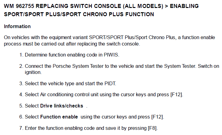 There were some that said function enable codes needed to be input into several control units in PIWIS, not just the PCM. There were some claims that when enabling codes didn’t match up between various control units, whatever you enabled would eventually be disabled after a few days. Further digging into the 981 service manual did indeed reveal one section regarding the installation of a new “Switch Console” that Sport Chrono needed to be reactivated via function enable in the Air Conditioning control unit in PIWIS.
