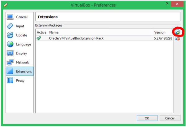 2. Log into your computer into the administrator account. Install VirtualBox. Once installed, open the program and then install the extension pack. You can’t install the extension pack unless you are logged in as an administrator. Installing the extension pack needs to be done from the preferences window of the VirtualBox program. If required, Google for how to do this. There are lots of videos how. Image below is what it should look like after the extension pack is installed. If not installed, it won’t be listed. Click the + button (red circle), find the extension pack file you downloaded and select it to be installed.