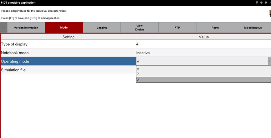 10. PIWIS is setup to operate in ‘V’ mode (after sales mode), which is what is used in the dealership. You can change to either of the other modes, E = developer, or P = production. When you initially open the program and you get the first page with the picture of the Cayman, click settings, then diagnostic configuration and then choose the model line. Click the mode tab at the top, and now you can go down to ‘operating mode’ and change the mode of the software. Save. Close. Now open the diagnostics for your car type and you should be in the new mode.